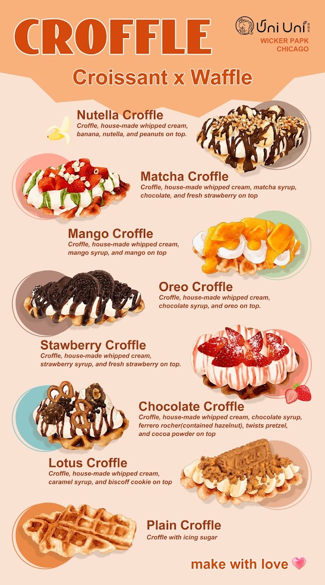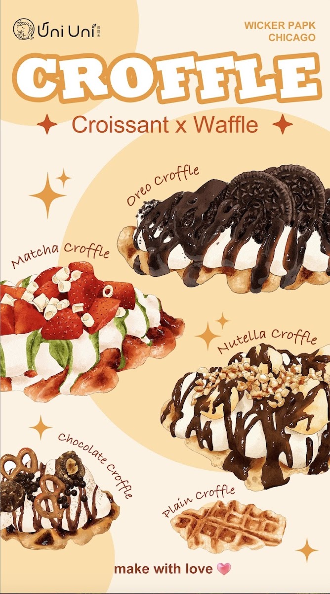 Croissant Waffle-Introducing the irresistible Croffle from Uni Uni Bubble Tea Wicker Park—a perfect fusion of croissant and waffle. This delightful treat combines the flaky, buttery layers of a croissant with the golden crispiness of a waffle, creating a unique texture that’s crunchy on the outside and soft on the inside. Each croffle is freshly made to order, delivering a warm, melt-in-your-mouth experience with every bite.